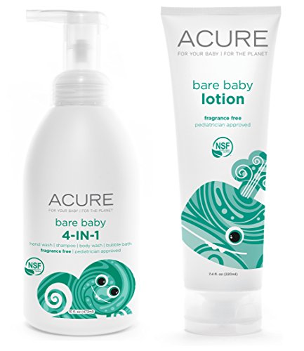 - This bundle includes 1 Acure Organics Bare Baby 4-in-1 16 oz. (works as organic baby shampoo, organic baby wash, organic hand wash and organic baby bubble bath), 1 Acure Organics Bare Baby organic baby lotion 7.5 oz and 1 free tropical citrus castile soap 5 ml sample.