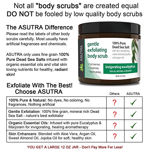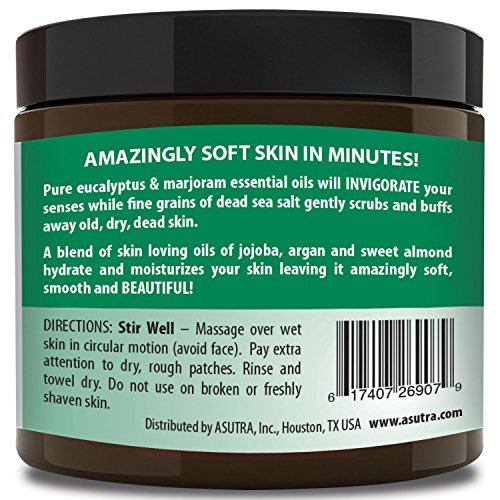 SAY GOODBYE TO DRY, DEAD, FLAKY SKIN! Fine grains of a hundred% pure dead sea salt will gently exfoliate the best layer of previous, dead skin revealing your true younger self. - one hundred% genuine, pore cleansing, mineral wealthy Dead Sea Salts - Infused with skin nourishing & smoothing oils & vitamins - Blended with natural essential oils for thoughts & physique healing - NO synthetic chemical substances, fragrances or artificial colors - Cleanse away blocked pores, blackheads & in-grown hairs! GET THAT SILKY, SMOOTH CELEBRITY GLOW Stars aren\'t born with excellent skin - they exfoliate! Our physique scrubs are packed with Aloe Vera and proven skin smoothing oils of Jojoba, Argan and Sweet Almond that NOURISH & PAMPER your skin. As you buff away, these ultra-hydrating oils wealthy in moisturizers penetrate your skin leaving it feeling amazingly soft, smooth, and RADIANTLY Lovely! A lot more THAN JUST A SCRUB - It\'s SKIN Treatment The fine grains of dead sea salt penetrates to unclog pores minimizing blackheads, blemishes and in-grown hairs leaving skin visibly brightened. ASUTRA only uses 100% mineral rich Pure Dead Sea Salts - NATURE\'S Ideal EXFOLIATOR- there is a big difference! - every thing on your physique is a hundred% natural & organic. Never Overlook THE AROMATHERAPY Benefits Breathe in the invigorating, healing aroma of Organic Eucalyptus & Marjoram crucial oils - no artificial fragrances or perfumes. This will be with you long following the shower - you will really like it! YOUR SKIN WILL Really feel SO SOFT AND SMOOTH It truly is RIDICULOUS! Our customers adore the way this scrub naturally transforms their skin into a softer, smoother and youthful glow. Your valuable skin will be left more healthy, hydrated and gorgeous. Attempt It!