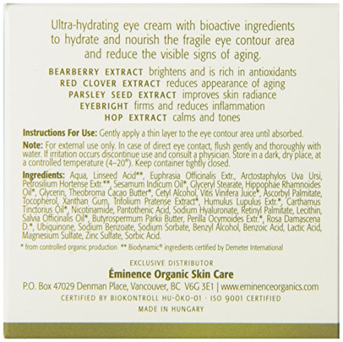 Eminence organics biodynamic bearberry eye repair cream advantages for all skin kinds such as sensitive nourishes and hydrates the delicate eye spot revitalizes skin to reduce wrinkles and smooth skin improves moisture and skin toughness protects skin from free radical injury minimizes fine lines and wrinkles up to 40% in just 28 days functions bearberry extract is a skin nourishing antioxidant that protects skin from cost-free radical harm and lightens pigment eyebright is a anti-inflammatory that minimizes puffiness hop extract calms and soothes skin red clover extract improves wrinkles and soothes skin Eminence organics is a very efficient, completely organic skin care line. With all naturally organic components these hand-created items are powerful and incredibly healing. Rich in nutritional vitamins, lively ingredients and nutrients, Eminence products will give you fast outcomes that you will see and truly feel.