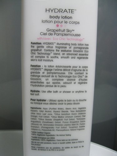 USDA Certified Natural, 100% Vegetarian Ingredients HYDRANTE illuminating body lotion has the gentle citrus fragrance of pomegranate grapefruit. Contains the exclusive Giovanni Eco Chic Technology mix, an superior important oil complex to soothe, smooth and regenerate skin\'t misplaced moisture.