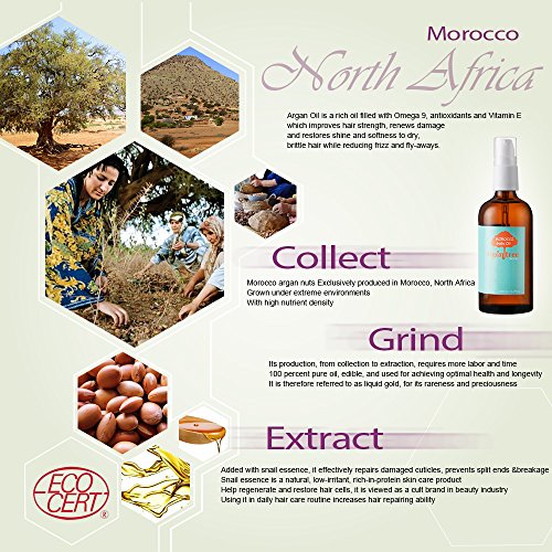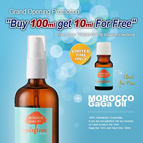 GRAND OPENING PROMOTION - BUY 1 100ml and GET 1 10ml FOR FREE!!! Argan Tree Morocco Gaga Oil For Hair - 100% Organic Certified & Imported from Morocco. Added with snail essence & other fruits extract.- Prevents Frizz & Revitalizes Natural Hair Shine & Silkiness - See immediate result with its instant absorption feature from this lightweight, and delicate natural oil -100% Satisfaction Guaranteed (3.4 Oz / 100ml)