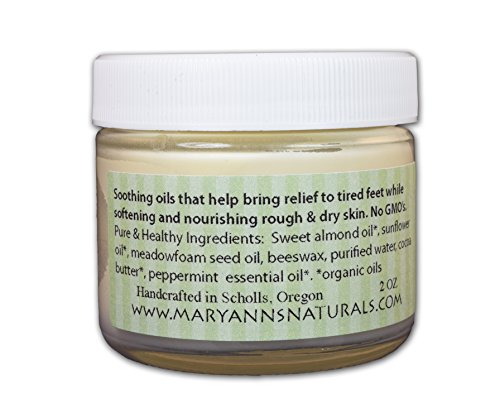 Mary Ann\'s peppermint foot cream brings a lot necessary relief to tired, aching feet. This wonderful cream consists of soothing oils that will heal and nourish rough, dry skin.
