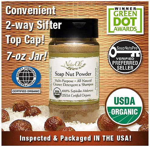 • #1 selling brand IN THE USA! ---- Finely ground from fresh de-seeded, wild-harvested, all-natural organic soap nuts / soap berries ---- NOT CHINA GROWN! ---- No chemicals, pesticides, industrial pollutants or contaminants. ---- USDA Certified Organic* Sapindus Mukorossi! ---- *USDA is the official Organic Certification for products grown or packaged and sold in the US. ---- INCLUDES: Convenient size jar with 2-way Shaker Cap.