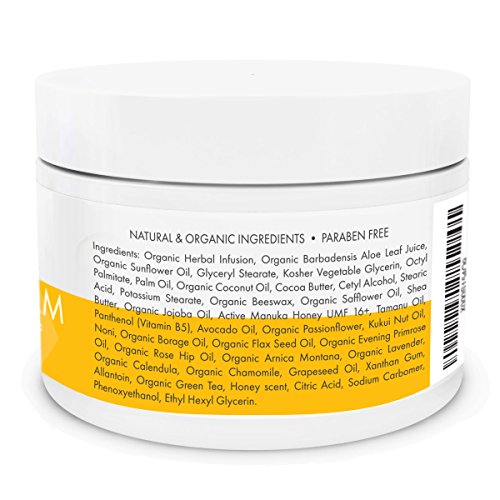 - NATURAL AND ORGANIC INGREDIENTS - Paraben free. Made with UMF 16+ Manuka Honey, Organic Barbadensis Aloe Leaf Juice, 12 Essential oils, Cocoa Butter, Shea Butter and reNeu's proprietary Organic Herbal Infusion.