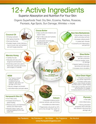 Ultimate Organic Moisturizer Cream for Face & Body - Manuka Honey - Aloe Vera- Coconut Oil -Shea Butter -Anti-Aging Dry Skin Repair Lotion -Treatment of Eczema, Psoriasis, Rashes, Rosacea, Wrinkles - Superior Moisturizer -100% Money Back Guarantee (2oz) 4.3 out of 5 based on 440 ratings. 440 user reviews